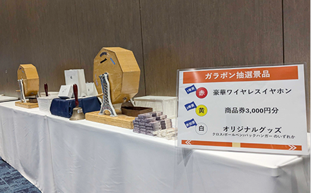 展示ブースでは、より一層ブース巡りを楽しんでいただくための企画としてスタンプラリーを開催していました。ブースを巡りながらスタンプを集めると豪華景品が当たるガラポン抽選に参加できるというもので、開場して早々に1等 のワイヤレスイヤホン(3つ用意していたうちの1つ)が当選されていたり、2等の商品券をお一人で2つ当選されている方などもおられ、楽しみながらブース巡りをしていただけたのではないかと思います!