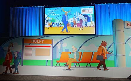 キービジュアルでは、様々に独立した異なる物事が共存する広がりを、捕食関係にあったり、生息地も違い、本来共存するはずのない関係性の「様々な動物たちが集っている駅」として表現しました。これらの動物たちは、1社1社、ひとり一人違う様々な課題を抱えた来場者の皆様でもあり、彼らが自分たちの目指すデータ活用の新しい世界へ向け、HULFTというプラットフォームから出発していく。そんなストーリーをビジュアルで表現しています。