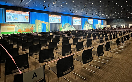 講演が行われるメインホールでは、ステージ上に5枚のスクリーンを等間隔に設置し、どの角度からでも視聴しやすくしました。席と席の間隔も広々としていたため、まったく窮屈感なく集中して聴講できたのではないでしょうか。