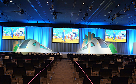 ステージ上は、電車が発車する駅のホームを模した造作となっており、視覚的・体感的にワクワクするような空間に仕上げました。