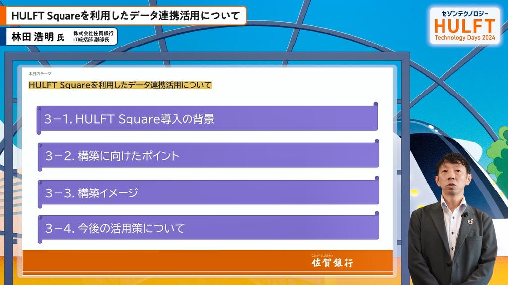 この講演では、佐賀銀行の林田氏がHULFT Squareを利用したデータ連携の取り組みについて説明しました。自己紹介から始まり、銀行の歴史や規模を紹介。その後、HULFT Square導入の背景として、業務の効率化とデジタル化への対応を挙げました。特に、アプリの機能追加に伴い、データ連携を自動化する必要性が強調されました。導入後は業務フローがシームレスになり、開発が迅速に進む利点が確認されました。今後はクラウドとの連携を進め、さらなる効率化を目指す姿勢が印象的でした。