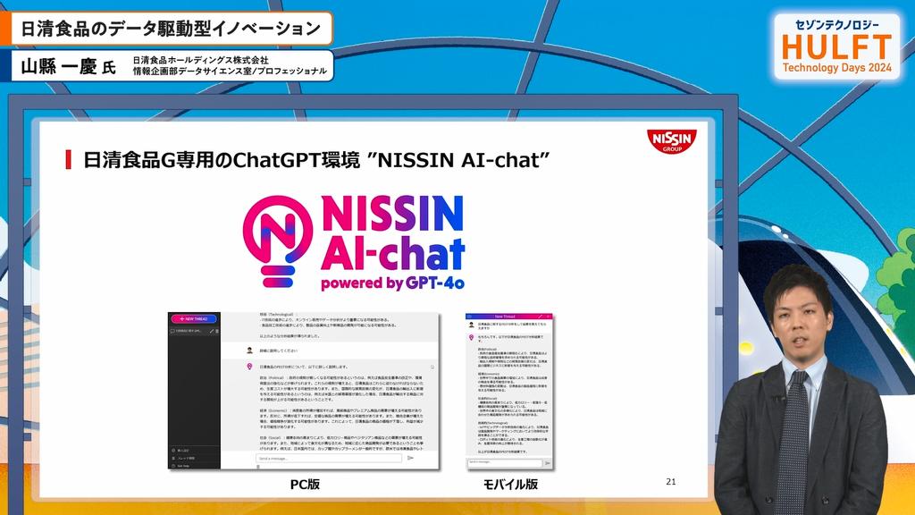 日清食品の山縣氏が、データ駆動型イノベーションと生成AIの活用について講演しました。日清食品は約70年の歴史を持ち、即席麺事業を中心に多様な商品を展開。デジタル化を進め、2030年に向けたデータ統合基盤の整備に取り組んでいます。データの集約と可視化を進めることで、業務の効率化や組織間のコミュニケーション向上を図っています。また、生成AIを活用し、販売データの自動分析や意思決定支援を目指しています。今後もビジネスITの連携を強化し、AIによる革新を推進していく意欲が印象的でした。