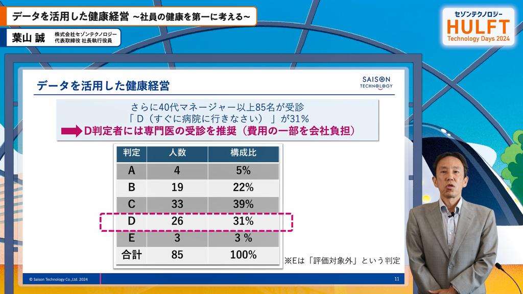 1日目の基調講演に続いて登壇する当社代表 葉山の講演では、データを基にした健康経営の重要性を強調するものでした。特に、自身の睡眠時無呼吸症候群の発見を通じて、健康状態の可視化が社員の健康管理にどれほど寄与するかを語りました。講演では、執行役員の睡眠検査結果を基に健康施策の導入を提案し、社員全体への拡大を計画中であることを示しました。また、データ分析により改善策を提案する意義を強調し、今後の取り組みを多様なメディアで発信する方針を述べました。健康経営が企業の生産性向上に寄与することが期待されます。