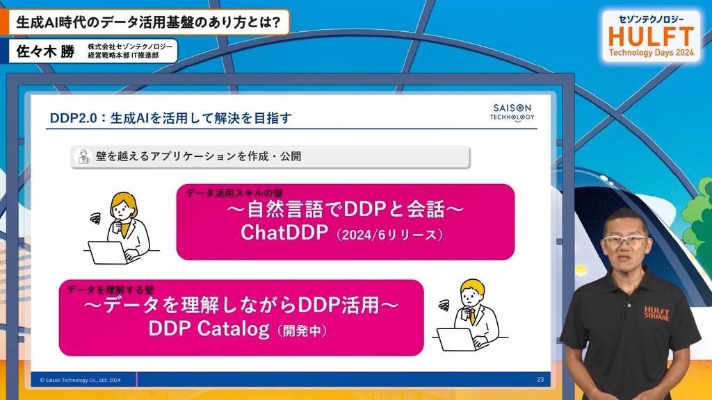 当社でデータ活用・生成AI活用の研究開発に携わる佐々木の講演は、セゾンテクノロジーの全社データ活用基盤「データドリブンプラットフォーム(DDP)」の構築と運用、および生成AIを統合した今後のビジョンに関するものでした。2020年にDDPの構想を始め、2021年にSnowflakeを導入、数年間にわたる運用を経て、生成AIを活用した新たな展開を紹介しました。