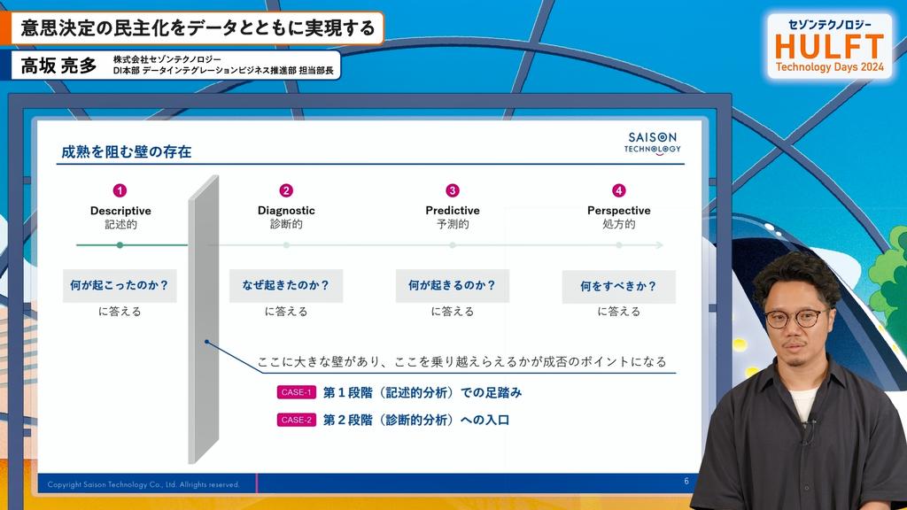 高坂の講演では、データ活用による意思決定の民主化について語られました。データ分析の成熟度を4段階に分け、技術的分析から診断的分析への移行が重要であると強調されました。データの品質、特に付加的品質特性の重要性を説明し、データオブザーバビリティの観点から品質を保つ方法を提案しました。具体的には、出典元の明記やデータチェックのパイプライン構築が推奨されました。このアプローチを通じて、データが組織の意思決定に貢献することが期待されます。