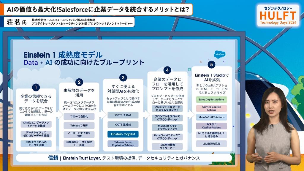 セールスフォースの荘氏による講演では、データ活用の重要性と課題が強調されました。特に、多くの企業が抱えるデータのサイロ化や連携不足、専門人材の不足といった問題に対し、Einstein 1 Platformを通じた包括的なデータ統合と活用のアプローチが紹介されました。データクラウドは、リアルタイムでのデータアクセスを可能にし、業務の効率化を促進。具体的なユースケースを交えた説明から、データ活用の可能性が広がる印象を受けました。企業が持つ情報を最大限に生かすための革新的なソリューションに期待が高まります。