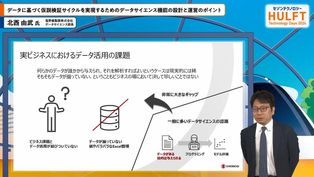 塩野義製薬 北西氏の講演では、データサイエンスの重要性とその実践方法が紹介されました。データに基づく仮説検証サイクルの重要性が強調され、観察から意思決定までのプロセスが科学的に実行されるべきとされました。また、データリテラシーの強化やデータベースの統合管理が成功の鍵であることが示され、部門間のコミュニケーションが重要であると語られました。データサイエンス部の設立は、デジタルトランスフォーメーションを推進する上で不可欠なステップであり、企業文化の変革に寄与することが期待されています。全体として、データを活用した意思決定の必要性が鮮明にされ、今後の展望に希望を抱かせる内容でした。