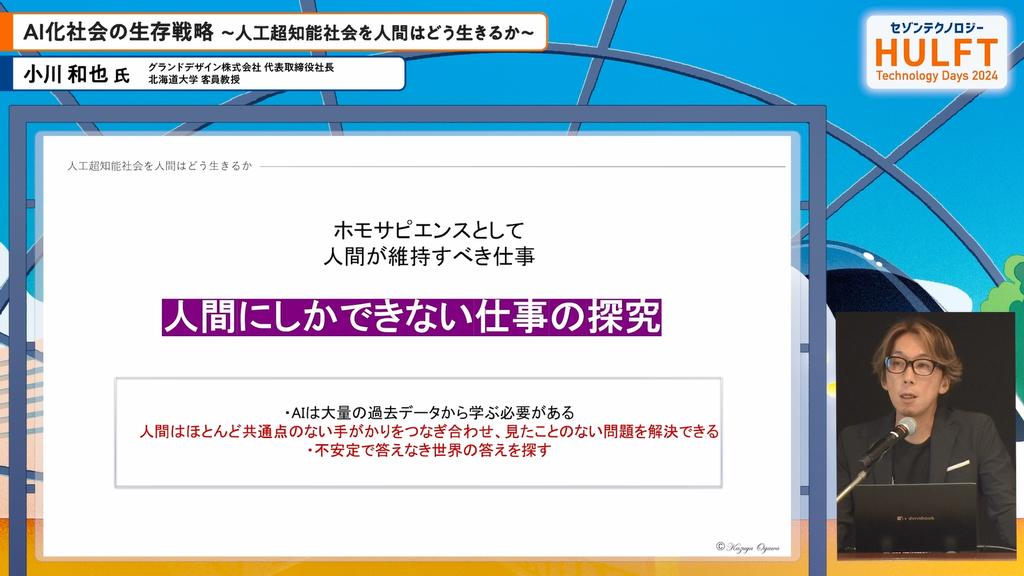 HULFT Technology Days 2024 最後のプログラムは、AI化社会における生存戦略について、グランドデザイン株式会社の小川和也氏が講演を行いました。小川氏は実業と研究のシナジーの重要性を強調し、AIの進化がどれほど急速であるかを歴史的な観点から解説しました。産業革命以降の技術の進展がいかに人類の生活を変えてきたかを述べ、今後は知識集約型の社会に移行すると予測しています。