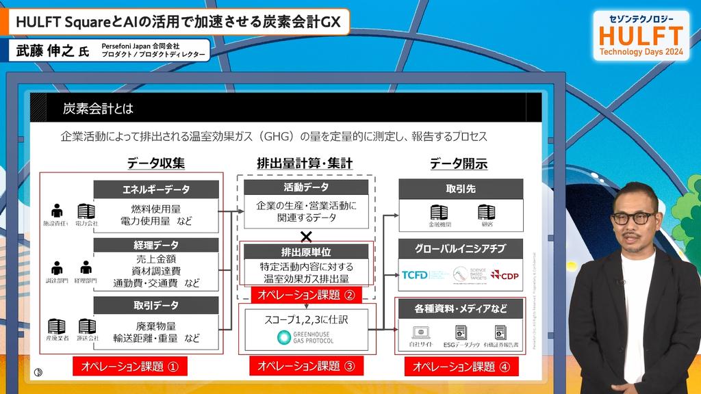武藤氏の講演では、Persefoni Japanの炭素会計の重要性とAI活用の未来について詳述されました。気候変動の影響が企業活動に深刻なリスクをもたらす中、炭素排出量の算定と情報開示が求められています。特に2025年からの国際基準導入に向けて、企業はデータ収集や分析の効率化を図る必要があります。AI技術とHULFT Squareの統合により、手作業の負担を軽減し、迅速なデータ処理を実現することが期待されます。これにより、企業は競争力を維持しつつ、持続可能な経営を進めることが可能になるでしょう。