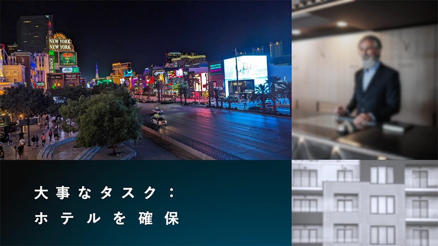 「自分たちで確保する」というのが明確になるまでしばらくかかりました。その間、北米支社側からは「早く決めないと無くなるよ」と脅され、焦りまくりました。結局、Expo会場のVenetianから近いホテルをスタッフ人数分確保。まずは一段落。