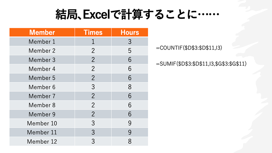 今どきではないかも知れませんが、Excelのcountifとsumifを使ってパズル組みしてみました。時間と手間はかかりましたが、なんとか条件に合うメンバー分担表が作成できました! 一応、結果だけでなくExcel表を含めてメンバーと共有し、メンバー間で交渉して調整可能にもしました。
