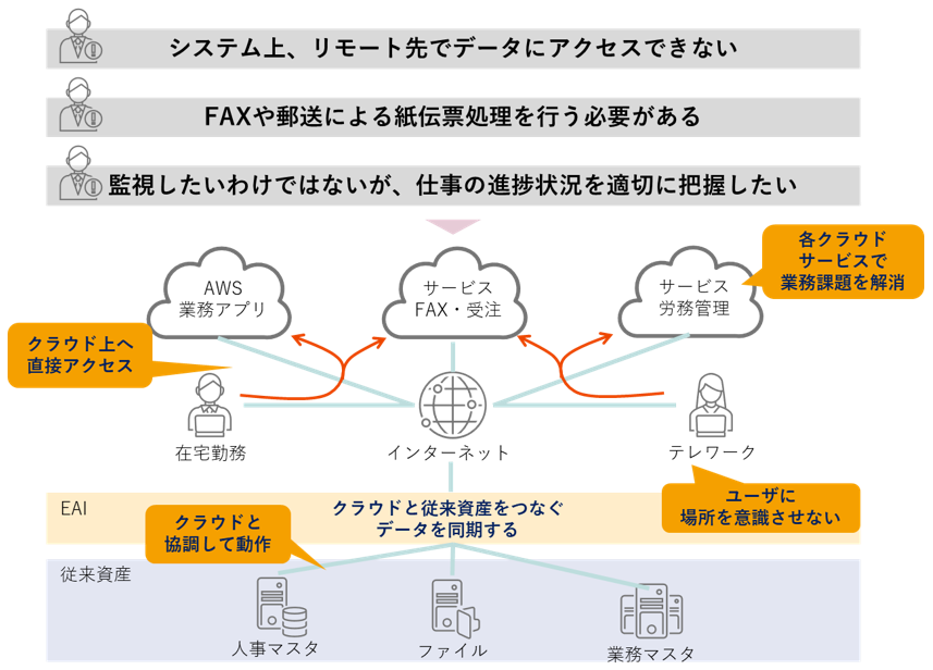 従来資産とクラウドが協調する事で、ユーザはそれが社内なのかクラウドなのか、意識する必要がなくなります。 副次的な効果として、リモート先からの社内一極集中がなくなりネットワーク負荷を低減させること(→ユーザにストレスを与えない)が可能です。