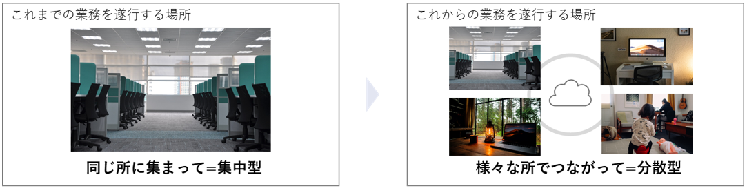 皆さんは「会社の中」「事務所」「オフィス」と言われるとどんな場面を頭の中に思い浮かべるでしょうか? ビルの中や工場内など何らかの物理的な空間を思い浮かべているのではないでしょうか。では、業務を遂行する場所と言われるとどんな場面を頭の中に思い浮かべるでしょうか? 在宅勤務やテレワークが始まり、必ずしもビルの中や工場内だけではなくっているはずです。