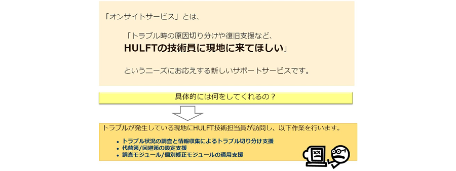 お客様からのご要請により、トラブル解決(お客様と事前に合意した解決)まで、 HULFT技術担当員の訪問による支援(オンサイトサービス提供)を行います。