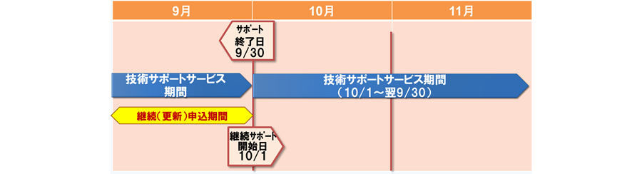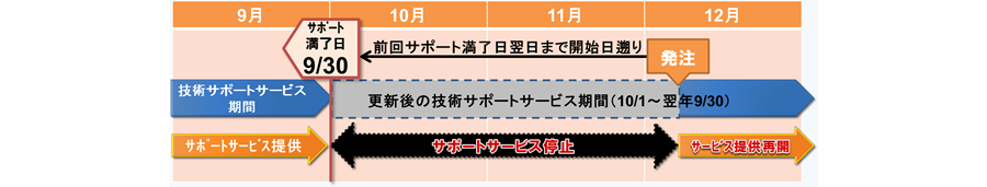 技術サポートサービス契約期間終了日以降に継続手続をお申込みいただいた場合でも、サービス開始日は、以前のサービス期間終了日翌日となります。