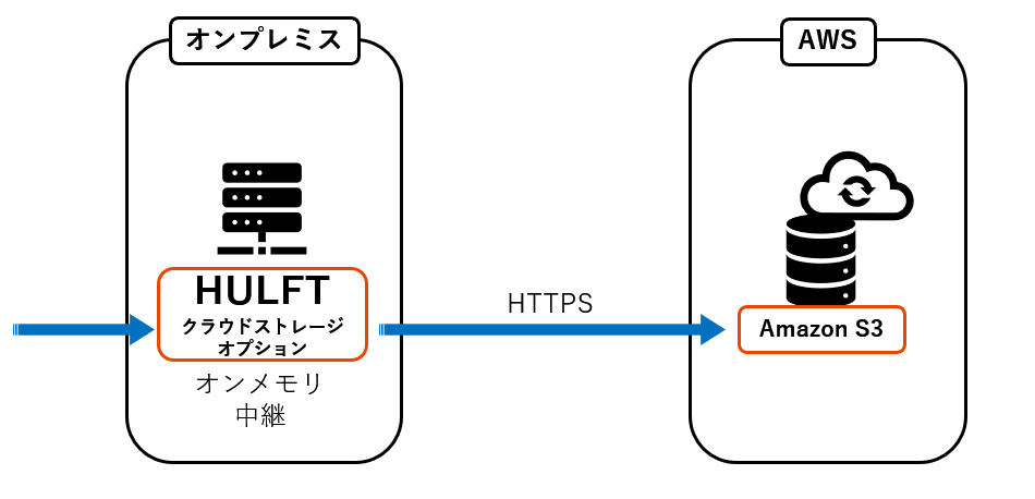 従来のHULFT クラウドストレージオプションでは以下のように、HULFTとS3間のHTTPS通信によって