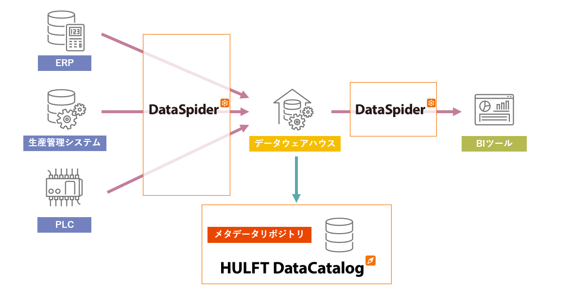 HULFT DataCatalogを導入し、ERPその他システムのデータを集めたデータ活用基盤を構築することにより、BIツールの使用者自らがデータの出所(来歴)を確認できるようになります。