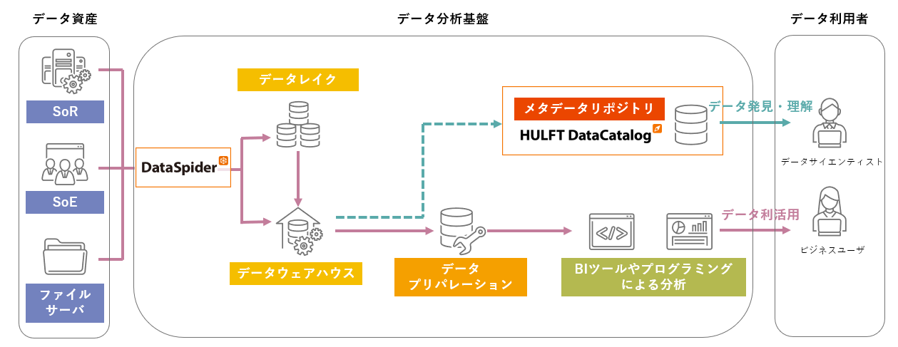 この場合は、問題を解決しデータ利活用を推進するため、HULFT DataCatalogを用いてどのユーザでも容易にデータにアクセスし、利用できるようなデータ分析基盤を構築します。