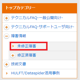 「技術サポートサイト」の画面左側の「トップカテゴリ」内の「障害情報」を展開し「未修正障害」を選択して下さい。