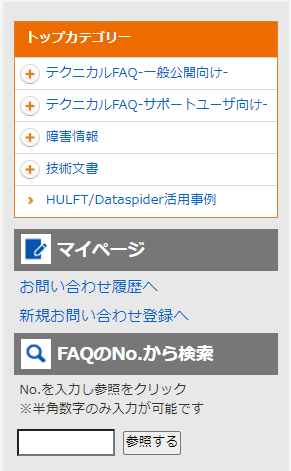 こちらの参照には、技術サポートサイトへのログイン後に、画面左側から該当のFAQ番号で検索してください。