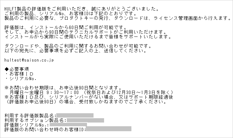 評価版の情報については、製品ダウンロードのご申請後、弊社から送信しております以下のメール